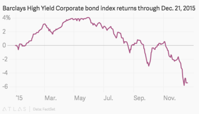 另一个与石油差不多的灾难是高收益债券,也就是通常所说的“垃圾债”。随着大宗商品价格崩溃,投资者们越来越急于逃离垃圾债市场,这令一些资产管理公司遭了殃。
