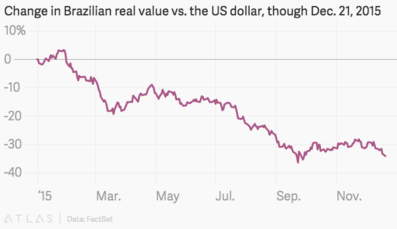 巴西现在摇摇欲坠。针对最高层官员的腐败指控引发了持续的政治动荡,巴西经济正在经历严重的衰退。这样的背景下,巴西雷亚尔兑美元已经贬值超过三分之一。