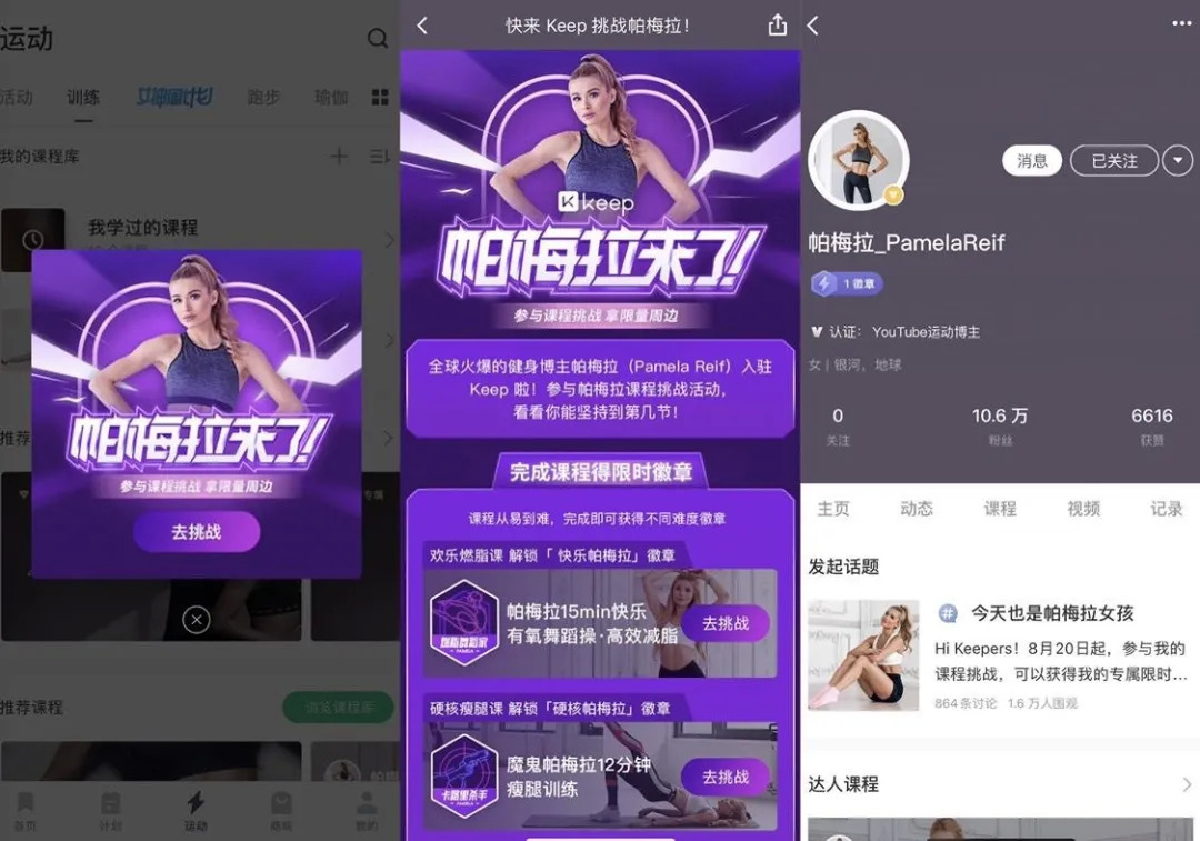 帕梅拉除了会在 Keep 长期稳定发布独家或首发免费课程外,还有社区互动答疑,训练计划、挑战活动、品牌合作等,相对其他平台更加深度和系统。