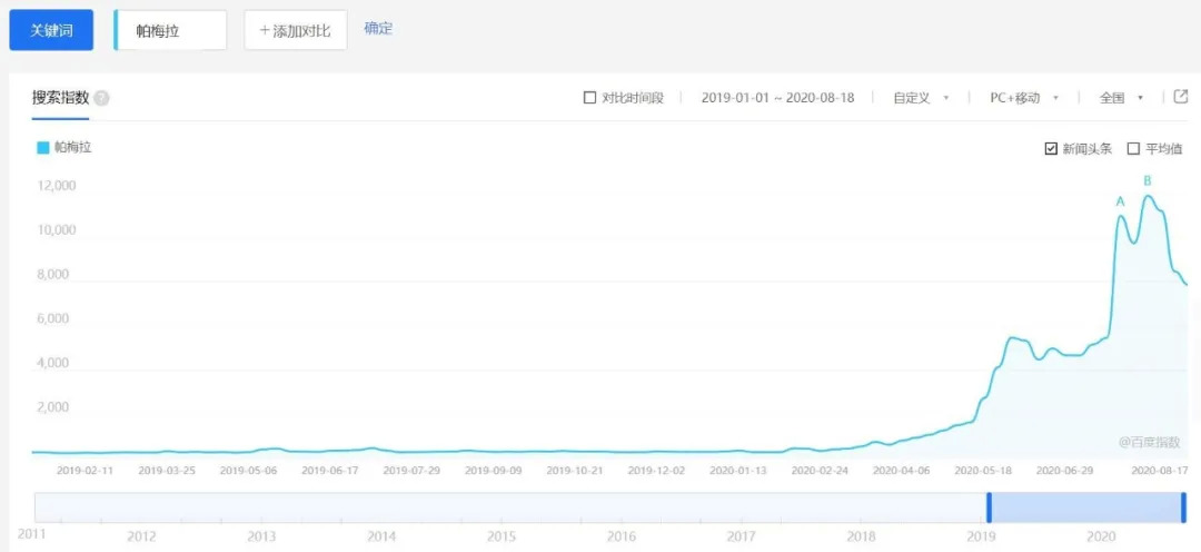 百度搜索指数显示,进入2020年,帕梅拉的搜索热度一路上升,涨幅高达40倍。
