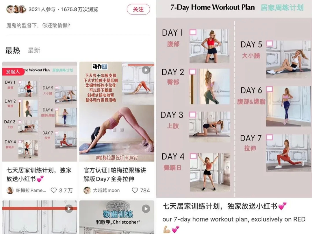 受限于小红书的视频时长,帕梅拉主要分享美食、跟粉丝互动。她在小红书发起的#帕梅拉跟练打卡#话题,目前已经有超1600万次浏览、3000多人参与。“独家放送小红书”的训练计划也提高了粉丝的打卡积极性。