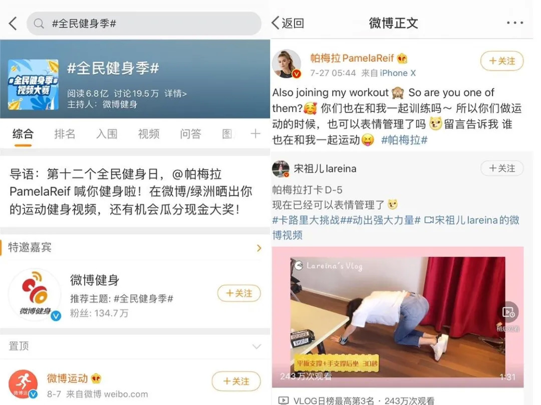 微博则是帕梅拉“出海社交”的主阵地。不仅跟微博官方合作推出#全民健身季#话题,帕梅拉跟周六野、宋祖儿等明星和博主也常常互动,进一步加快其出圈的步伐。