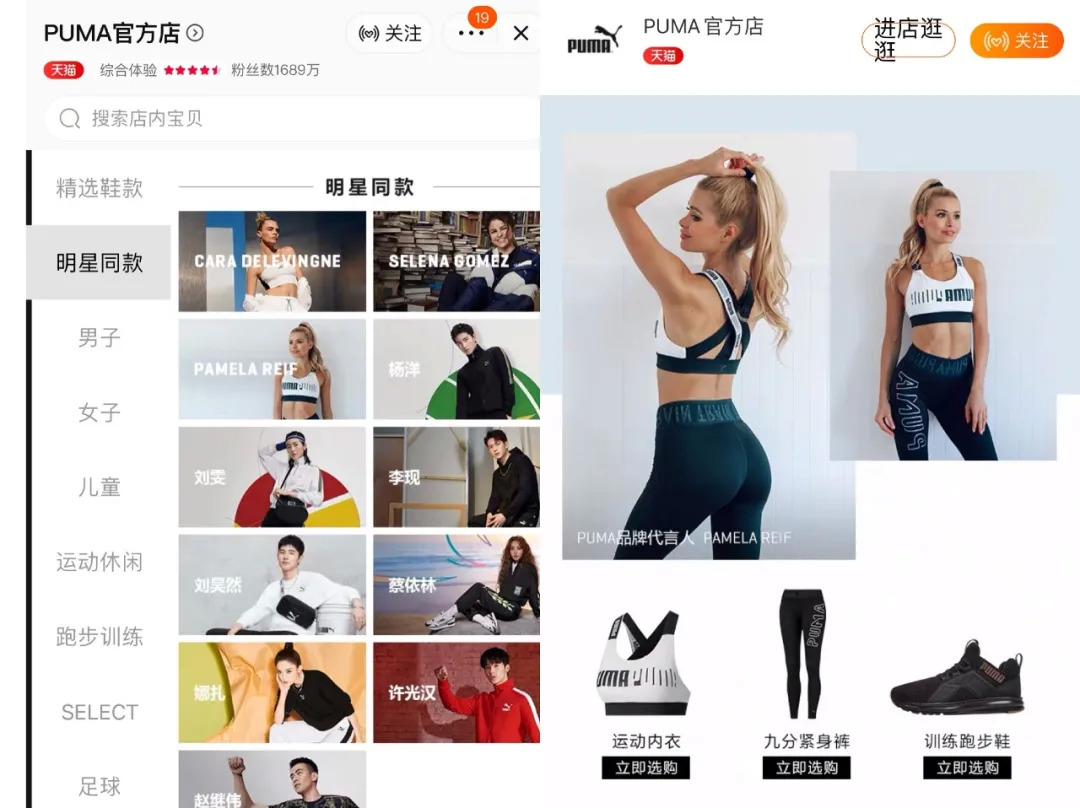在PUMA天猫官方店可以看到,明星同款的商品合集中,帕梅拉是唯一一位健身网红博主。不过,根据店铺客服的口径,帕梅拉并非拿到代言人头衔,目前只是合作博主。
