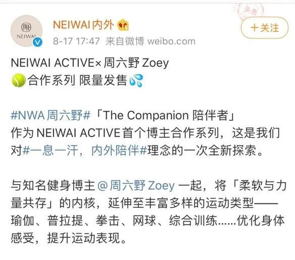 不仅传统运动品牌们青睐这些健身博主,就在几天前,国内新锐内衣品牌内外与周六野的合作限量款也正式发售。