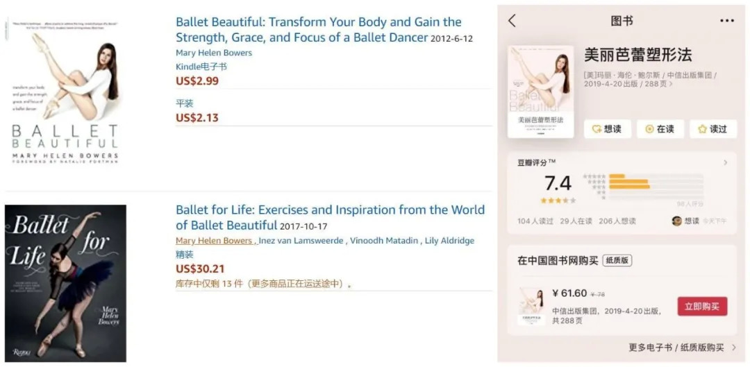 早在2012年,Mary HelenBowers就出版了书籍《Ballet Beautiful》,2017年,又出了续集《Ballet for Life》。去年,中信出版社将她的第一本书汉化出版,但从豆瓣数据来看,反响平平,仅有104人标记读过,98人评分。