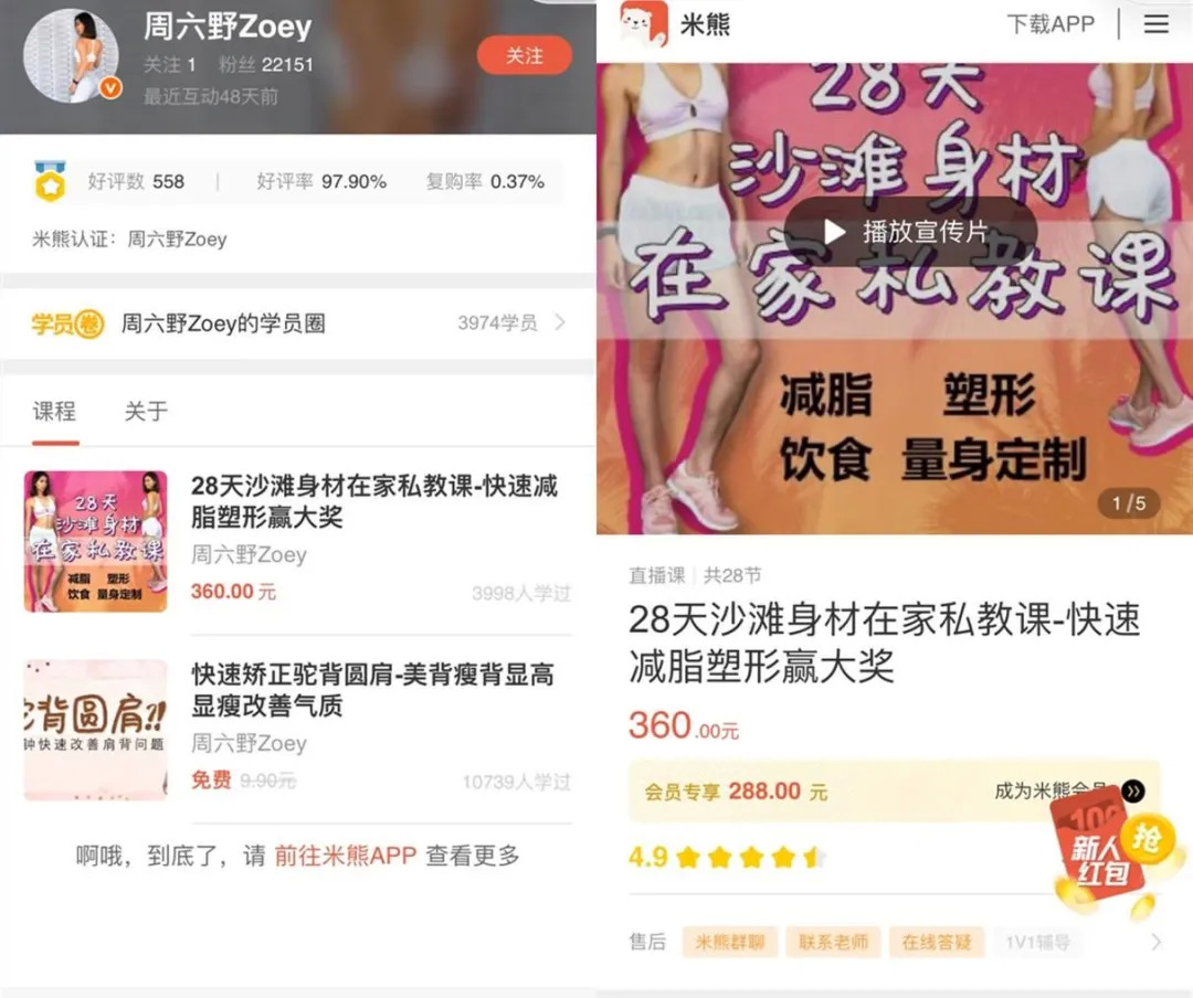 2016年年底,周六野开始发布视频,次年年中,她的私教课程就开始在微信渠道发售,很快也在她的淘宝店铺上架。仅微信一个渠道,周六野定价360元的私教课程就卖出100多万元销售额。