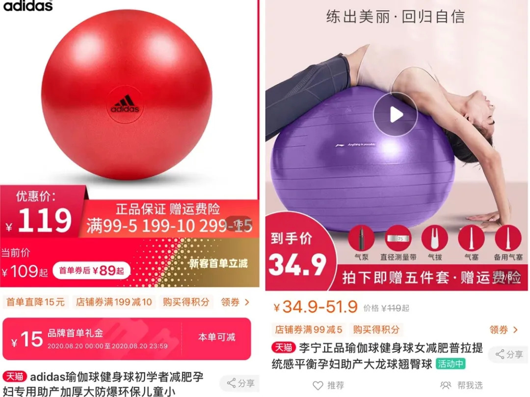 拿瑜伽球来举例,李宁、迪卡侬的定价在40-60元之间,阿迪达斯则是109元。相比之下,周六野138元的定价显得有点“辣手”。