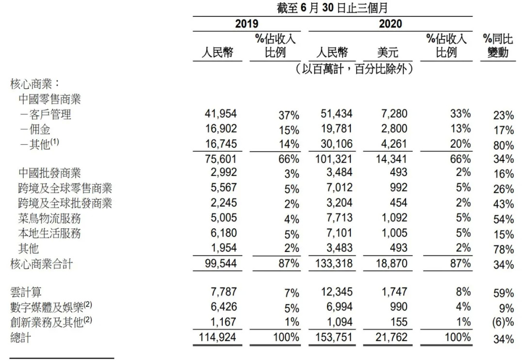 对阿里财报而言,外界最为关注的永远是核心业务电商。截至2020年6月,中国零售市场移动月活跃用户较2020年3月增长2800万,至8.74亿。有媒体就据称计算称,13亿中国人中,每3个中国人中就有2个中国人在使用淘宝或支付宝等阿里巴巴旗下的APP。