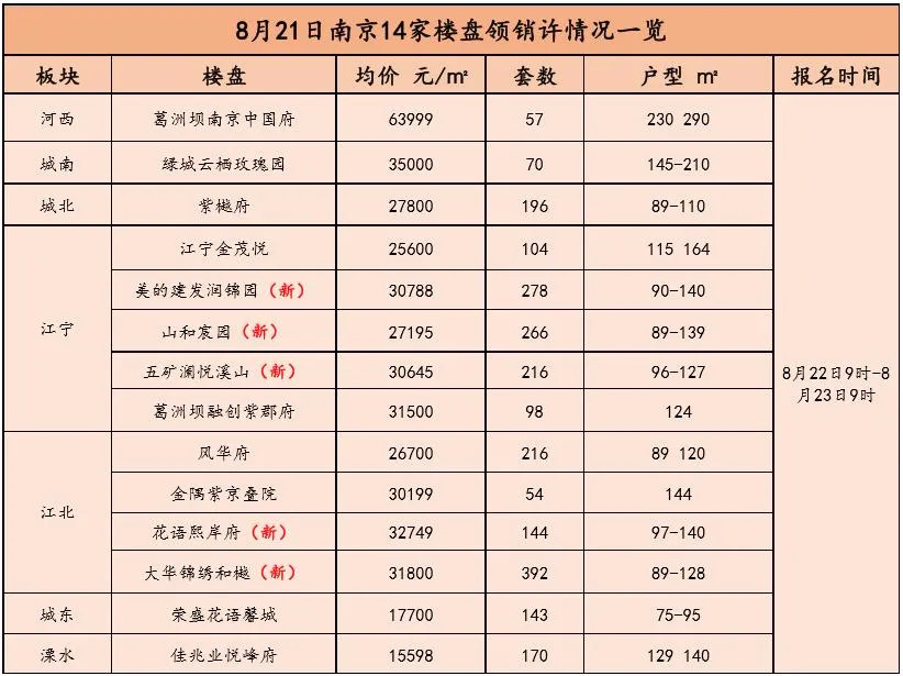 就在昨天(8月21日),南京共有14家楼盘新领销许,包括多个热门板块的热门楼盘,产品类型涵盖刚需和改善盘,最高销许均价达到了6.4万/㎡!