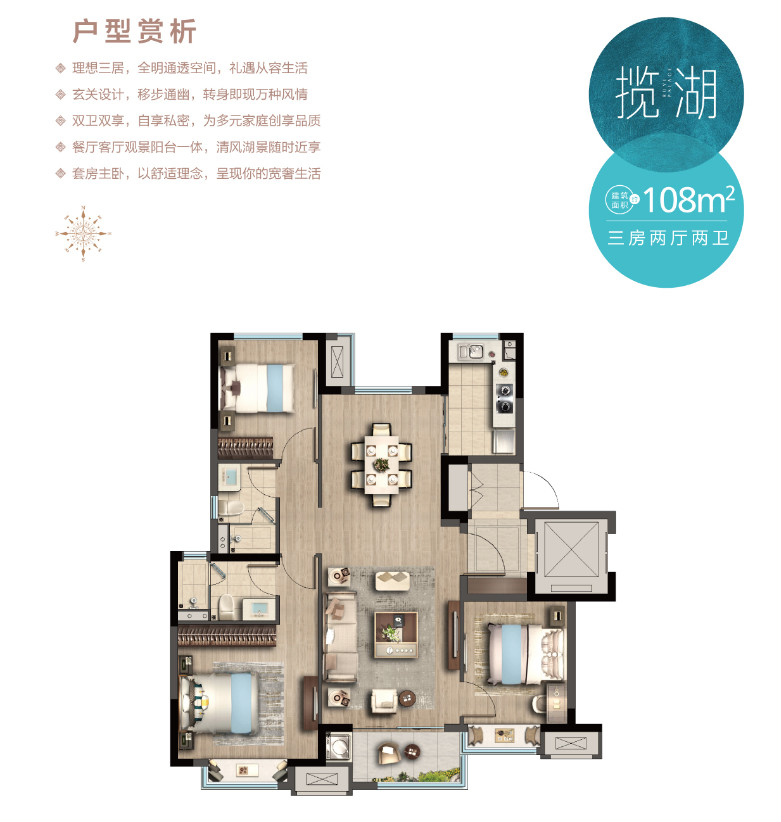 108㎡三房户型,兼具刚需跟改善人群,户型空间大舒适性更强;并且双卫的设计,让住户拥有私享空间,不再担心尴尬,居住体验更佳!