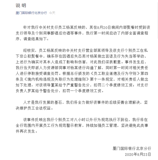 据厦门国际银行北京分行官方微信23日发表声明,针对厦门国际银行中关村支行员工杨某反映的,其在8月20日晚间内部聚餐时受到该支行领导及个别同事醉酒后劝酒等事件,银行第一时间启动了内部全面调查程序,调查结果如下: