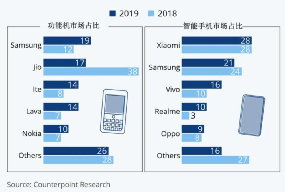 在印度智能手机市场排行前五的手机厂商中,有4家来自中国,分别是小米、vivo、Realme、Oppo,它们占据了印度智能手机市场超过一半的市场份额。