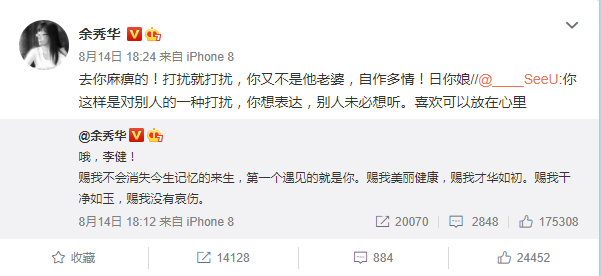 这年头上网发言,总要担点被人抬杠的风险,既没有道理可讲,又不敢开口大骂,怕落下个“不文明”“没形象”的把柄。不过最近,诗人余秀华的微博成了一本“脏话反杠指南”。8月14日,余秀华在微博上写了一段向歌手李健表达爱慕的文字,不出所料,很快就有好为人师的网友批评此举是对别人的“打扰”,“喜欢可以放在心里”。与大部分公众人物的隐忍沉默不同,余秀华迅速以脏话回击,在受到“公众人物怎么不讲文明”的指责和“封博”警告后,更是愈骂愈勇。