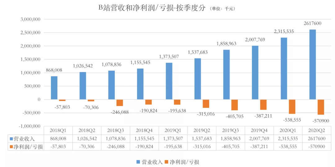 财报显示,B站二季度营收26.176亿元,同比增长70%;净亏损5.709亿元,环比增长6%,同比去年同期的3.15亿元亏损扩大了81%。