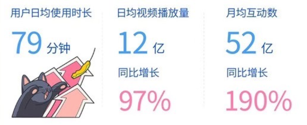 伴随着用户的高质量增长,社区规模与活跃度也在快速提升,各项主要数据均达历史新高。第二季度,用户日均视频播放量达到创记录的12亿次,同比提升97%;社区月均互动数达52亿次,接近去年同期的三倍。