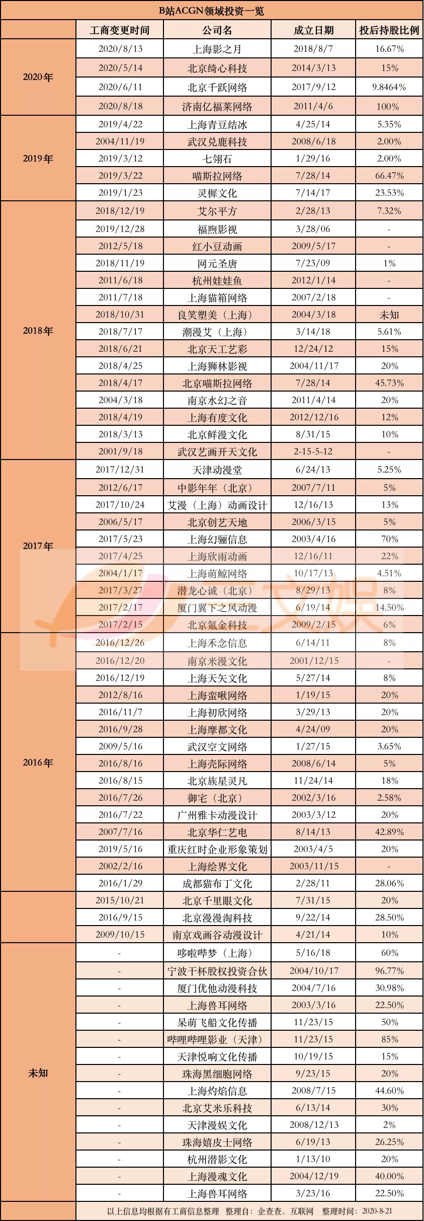 用户数据的上涨,和同期新上线的内容有直接关系。以内容为核心,B站在ACGN领域投资了不少公司。即使在文娱投资接近冰冻的2020年,B站也新增了多个投资项目,比如今年陆续投资了掌派科技、千跃网络、上海哆祈哆网络科技、绮心科技以及上海影之月等五家游戏相关公司。8月18日完成了对,ACTOYS(济南亿福莱网络科技有限公司)的全资收购。(扩展阅读:B站收购ACTOYS:后者年收入近亿元,猫铃铛去年卖出150万只)