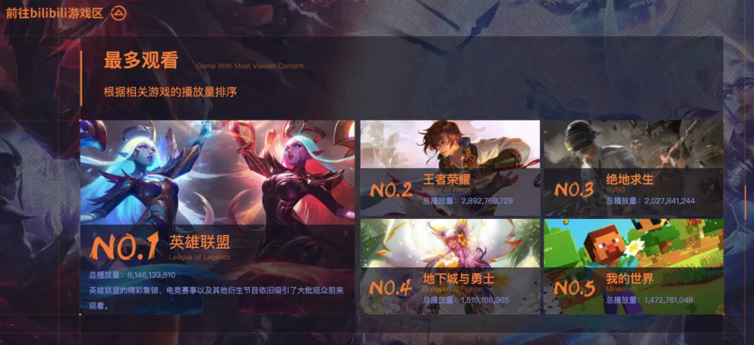 8月1日,B站与拳头游戏(Riot Games)共同宣布达成英雄联盟全球赛事战略合作。B站正式获得中国大陆地区2020-2022连续三年的全球赛事独家直播版权。在B站公布的近两年游戏区年度盘点中,用户观看最多的游戏均是《英雄联盟》,其中2018年总播放量超48亿,2019年总播放量更是高达81亿次。