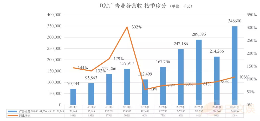 非游戏业务的收入主要来自增值服务、广告收入,以及电商和其他业务三部分组成。二季度,B站增值服务收入8.253亿元,同比增长153%;广告收入3.486亿元 ,同比增长108%;电子商务及其他的收入1.958亿元,同比增长58%。