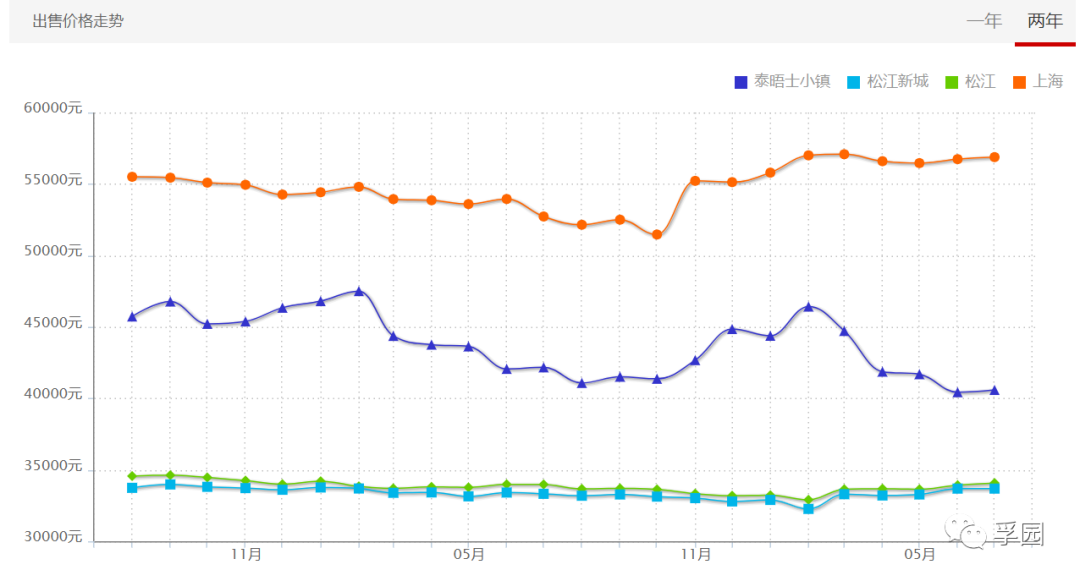 图:近两年泰晤士小镇、松江新城的均价对比