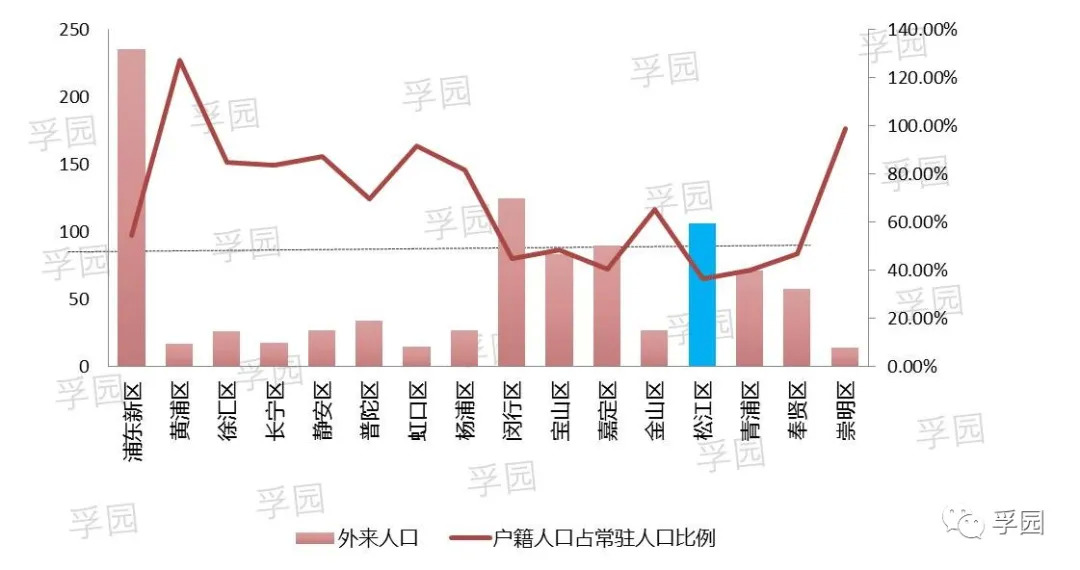 但户籍人口占比少并非一定表明区域产业具备先进性,导入的都是“先进人口”。比如松江大学城每年超十万来自全国各地的师生群体、松江工业园大量基础制造业产业人群,以及更为海量的为这些“非户籍人口”提供种种生活配套的“非户籍人口”。