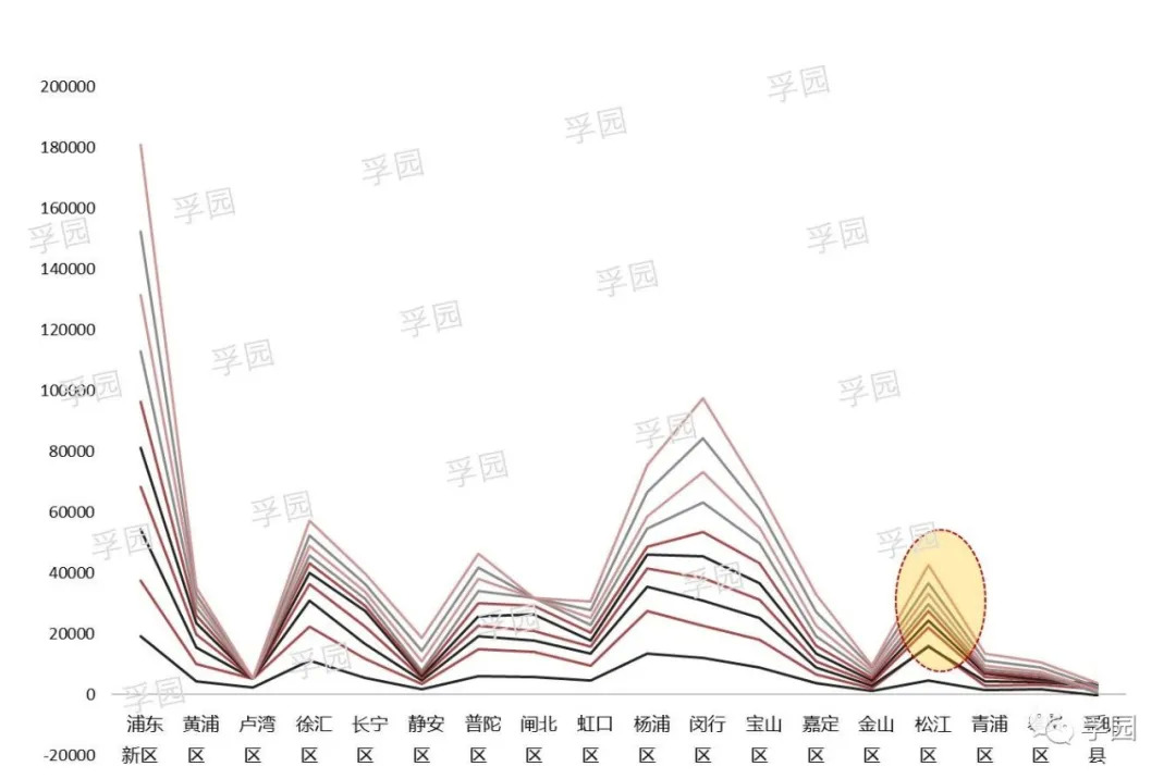 松江自此开始围绕G60科创走廊全力部署,推进产业结构优化与产业转型,同时仍能保持人口导入高速增长(上图),无疑是区域进入高速良性发展的一例明证。