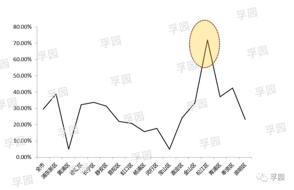 2019年最新数据显示(下表),松江当年户籍人口占比全市最低,仅为36.49%,而市场惯常认为近年来人才引进、人口导入最活跃的浦东、闵行该项统计数据分别为54.58%和44.62%,在地户籍人口比例远高于松江。