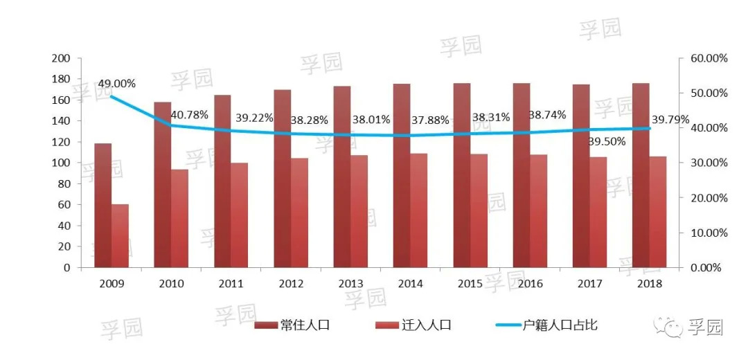 图:2009年-2018年松江常住人口、迁入人口、户籍人口比例