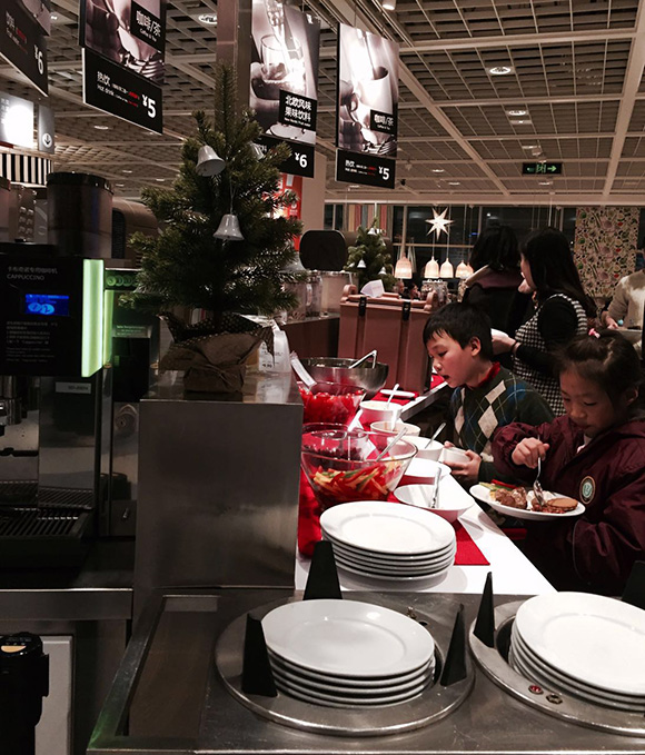 走进宜家商场,各种红色绿色的装饰,充满了圣诞节的喜庆氛围。宜家餐厅则辟出一块区域,供购买自助餐券的消费者用餐。