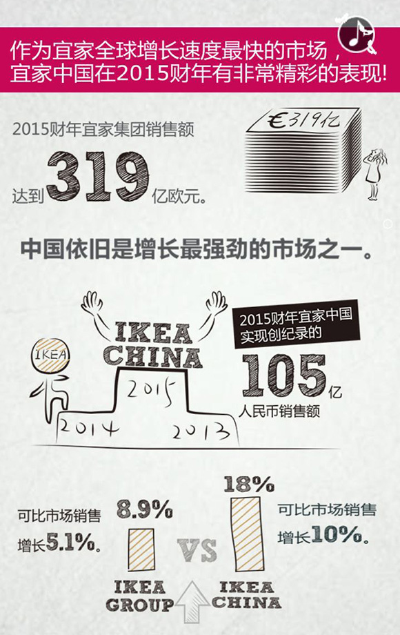 尽管由于近年来经济增长放缓及电商的冲击,但宜家并未遭遇其他传统零售商在中国的业绩寒冬。2015年财年,宜家集团在中国录得105亿元销售额,增长超过18%,可比市场销售增长10%,为增长最强劲的市场之一。