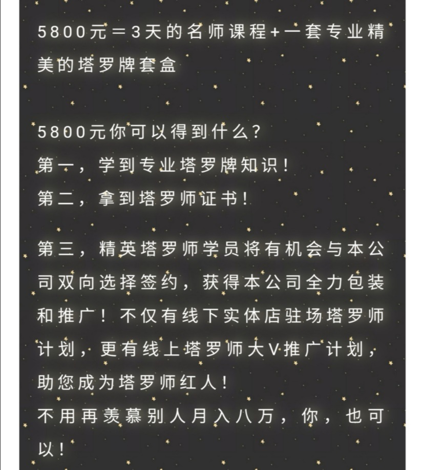 圈子的另一个问题,在虫大看来,是一些学艺不精的人以各种噱头招摇撞骗。例如一家机构的文章中,宣称只要花费5800元,便能学习三天名师课程,拿到塔罗师证书,并且有机会与公司签约成为红人,月入八万不是梦。通过这类线上塔罗课提供的一条龙服务,一个普通人从入门学习到“解决就业”,只需要花费几天时间。