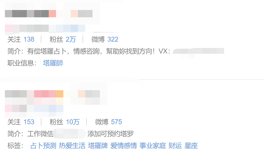在微博上,塔罗师们通常会在简介留下自己的个人微信作为沟通渠道,有的人会在置顶微博中注明自己的业务范围,但鲜少有塔罗师会在博文中列出自己的收费标准。