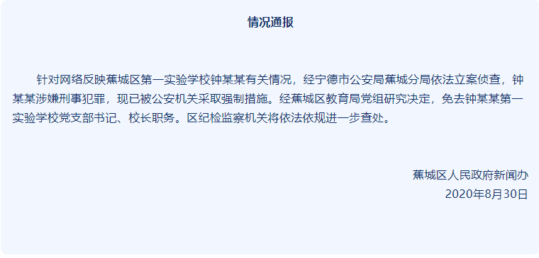 据“大梦蕉城”消息,8月30日,蕉城区人民政府新闻办发布情况续报,针对网络反映蕉城区第一实验学校钟某某有关情况,经宁德市公安局蕉城分局依法立案侦查,钟某某涉嫌刑事犯罪,现已被公安机关采取强制措施。经蕉城区教育局党组研究决定,免去钟某某第一实验学校党支部书记、校长职务。区纪检监察机关将依法依规进一步查处。