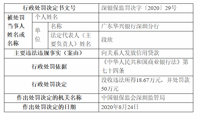 具体来看,银保监会深圳监管局指出,广东华兴银行深圳分行因向关系人发放信用贷款,对其没收违法所得18.67万元,并处罚款50万元;因流动资金贷款用于房地产开发,对其处以30万元的罚款;此外,该分行还因财务顾问服务存在质价不符,领20万元罚款。作出上述处罚决定的日期均为8月24日。