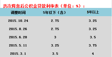 3月:2015年2月28日央行发布降息消息,自3月1日起下调金融机构人民币贷款和存款基准利率。金融机构一年期贷款基准利率下调0.25个百分点至5.35%;一年期存款基准利率下调0.25个百分点至2.5%;5年期以上贷款5.90%,5年以上公积金4.00%;其他各档次利率相应调整。