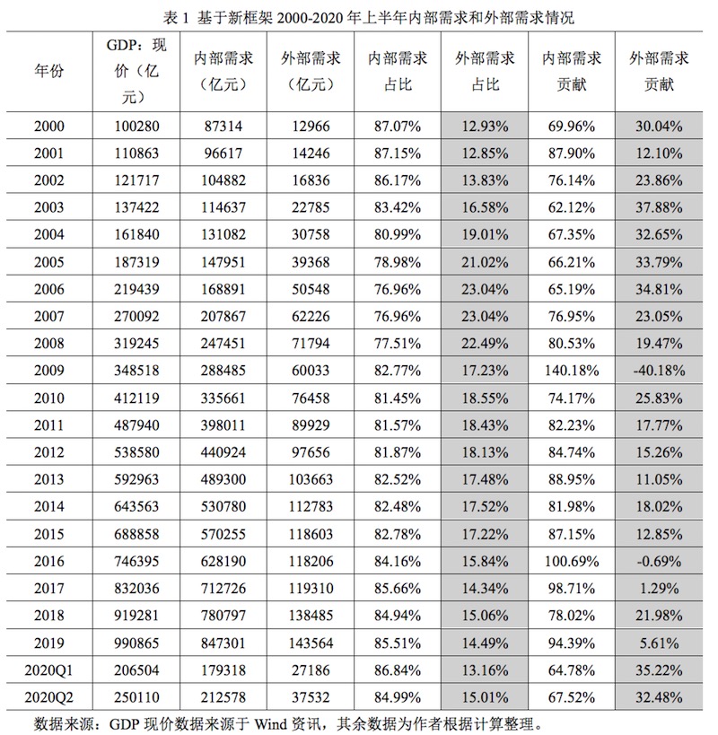 近期,中央多次提出要“形成以国内大循环为主体,国内国际双循环相互促进的新发展格局”,这是中央充分结合当前内外部环境深刻复杂变化以及我国进入新发展阶段背景下提出的重要战略部署。上述战略部署的贯彻落实势必要立足于内需,培育强大国内市场,降低对国际市场的依赖。因此,明确外需在经济中的占比和对经济增长的贡献对于未来宏观经济政策的制定和实施具有重要意义。