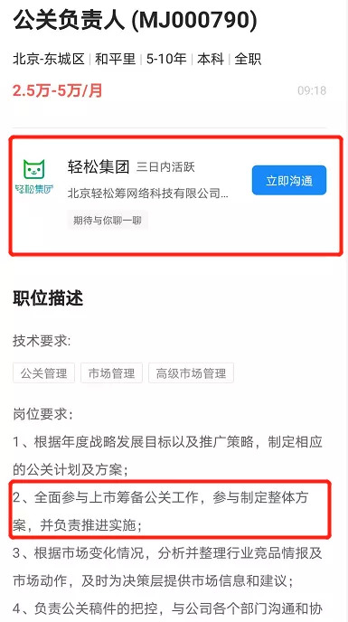 近日,读懂新金融发现:轻松筹正在招聘公关负责人岗位,月薪2.5万~5万元/月,以其标明的14薪计算,年薪最高为70万元,该岗位要求之一为:全面参与上市筹备公关工作,参与制定整体方案,并负责推进实施。