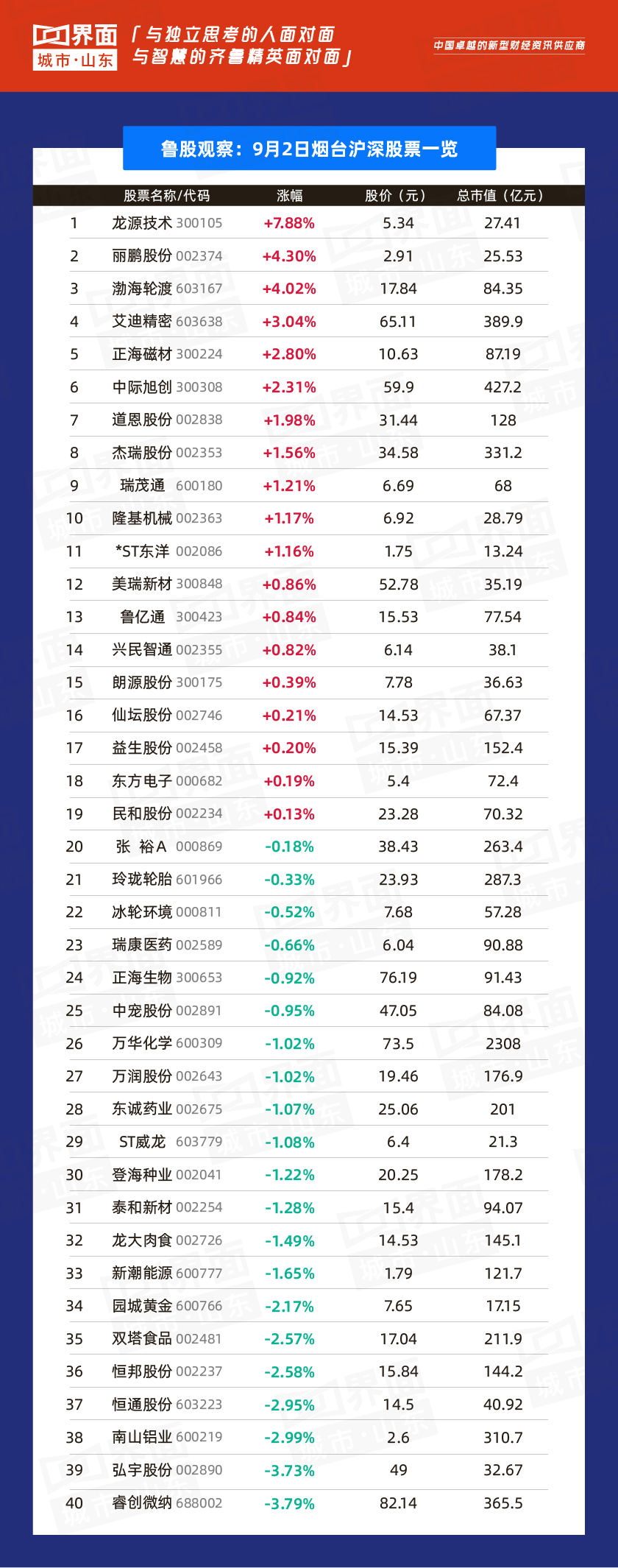 烟台市涨幅榜首:龙源技术(300105),涨幅7.88%,股价5.34元,总市值27.41亿元;