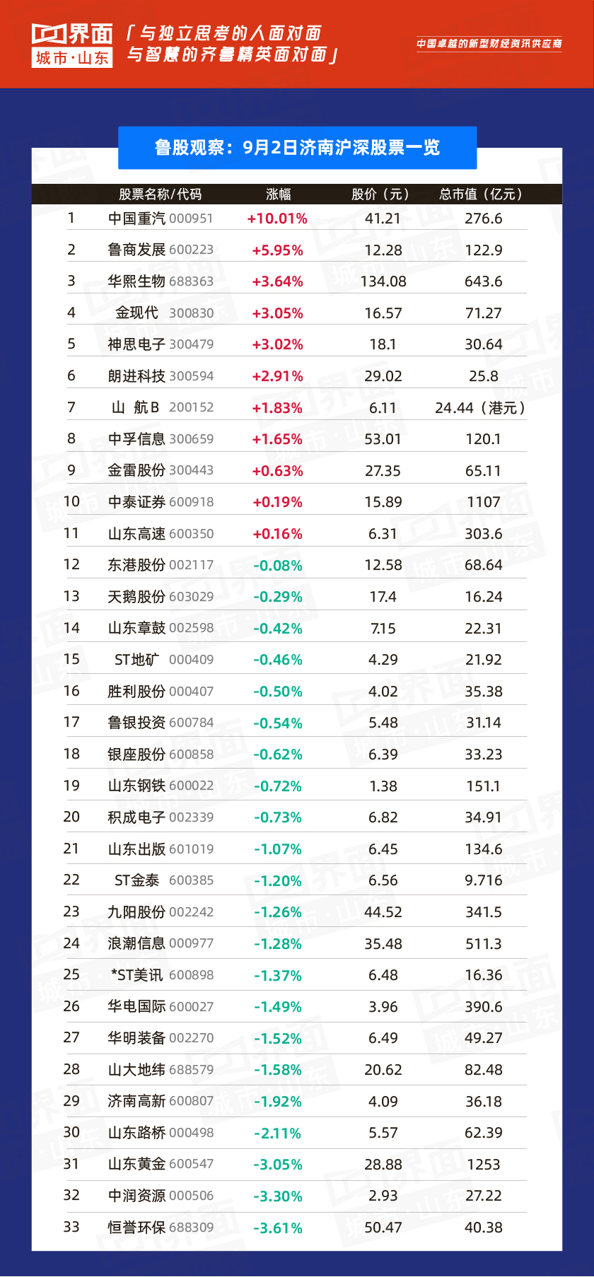 济南市涨幅榜首: 中国重汽(000951),涨幅10.01%,股价41.21元,总市值 276.6亿;