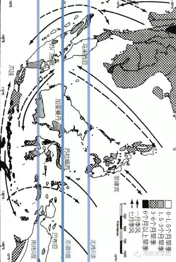 东南亚整体上位于热带,因而除了高纬度地区外整个区域内的温度都很高,不过,赤道地带的年降雨量和两侧热带腹地的降雨量是不同的(如图)。赤道地带主要位于赤道附近大约南北5度的印度尼西亚和马来西亚(菲律宾东部向北延伸的地带也是),全年没有季节变化,雨量非常充沛。相反,赤道之外的热带腹地具有"冬天"为干旱的特征,向南到澳大利亚,向北到中国南部,干旱持续几乎半年。