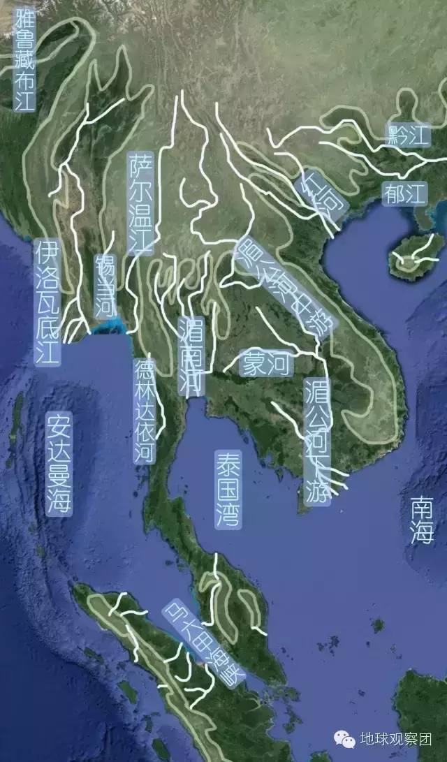 中南半岛有着众多南北向的大河:伊洛瓦底江、萨尔温江、湄南河、湄公河、红河,上述诸河除湄南河外都来自于中国云南,可以说,云南是整个中南半岛的上游(所以在云南建坝对下游的威慑作用是很大的)。