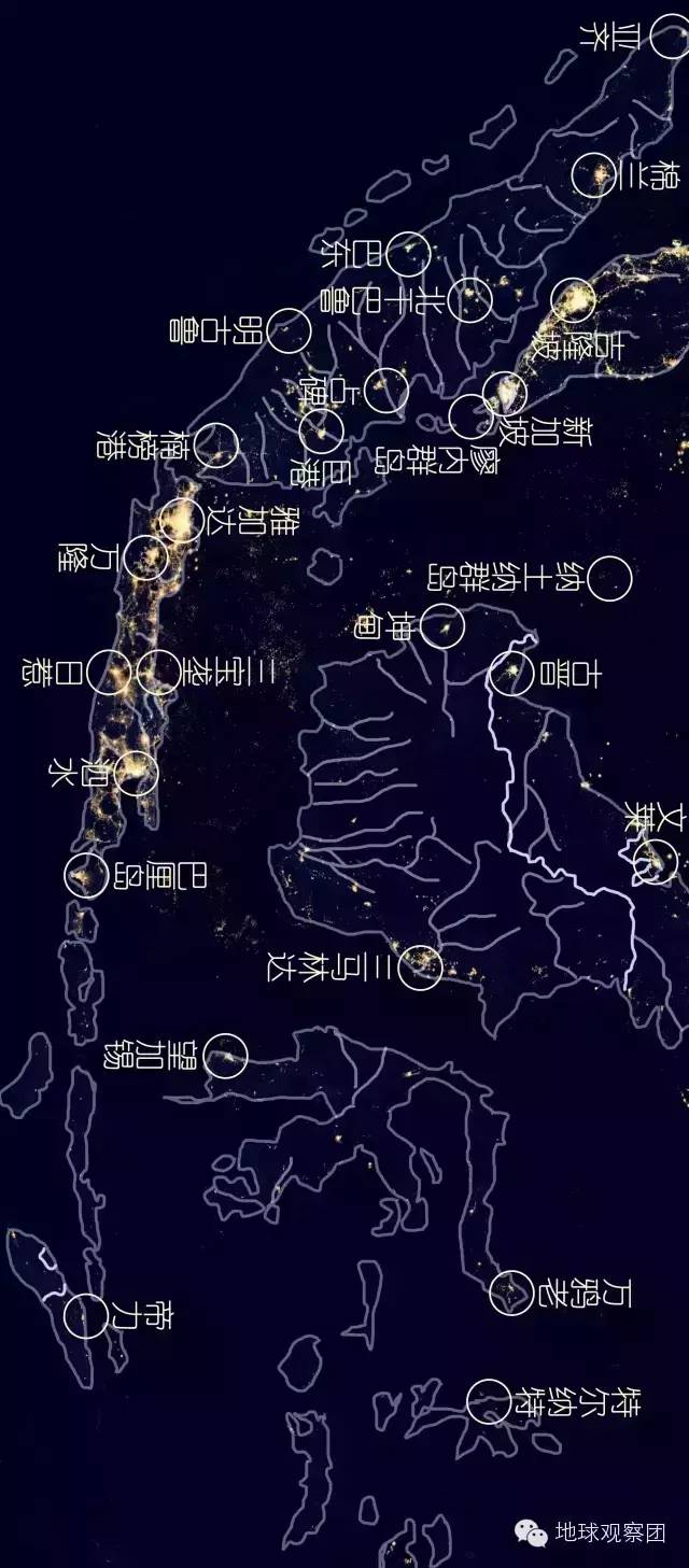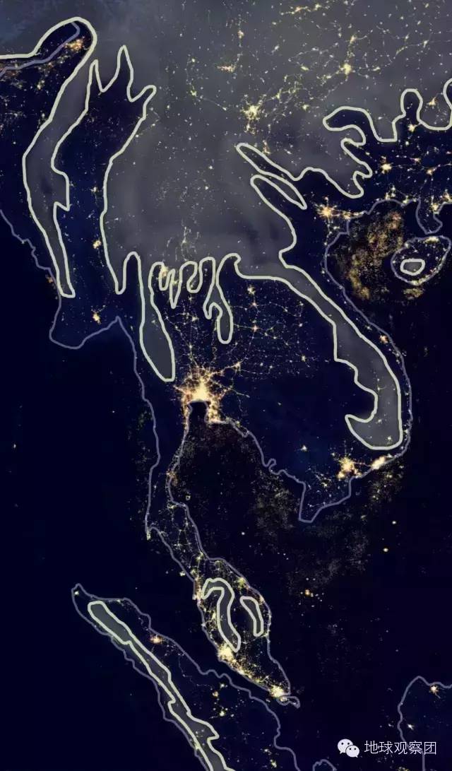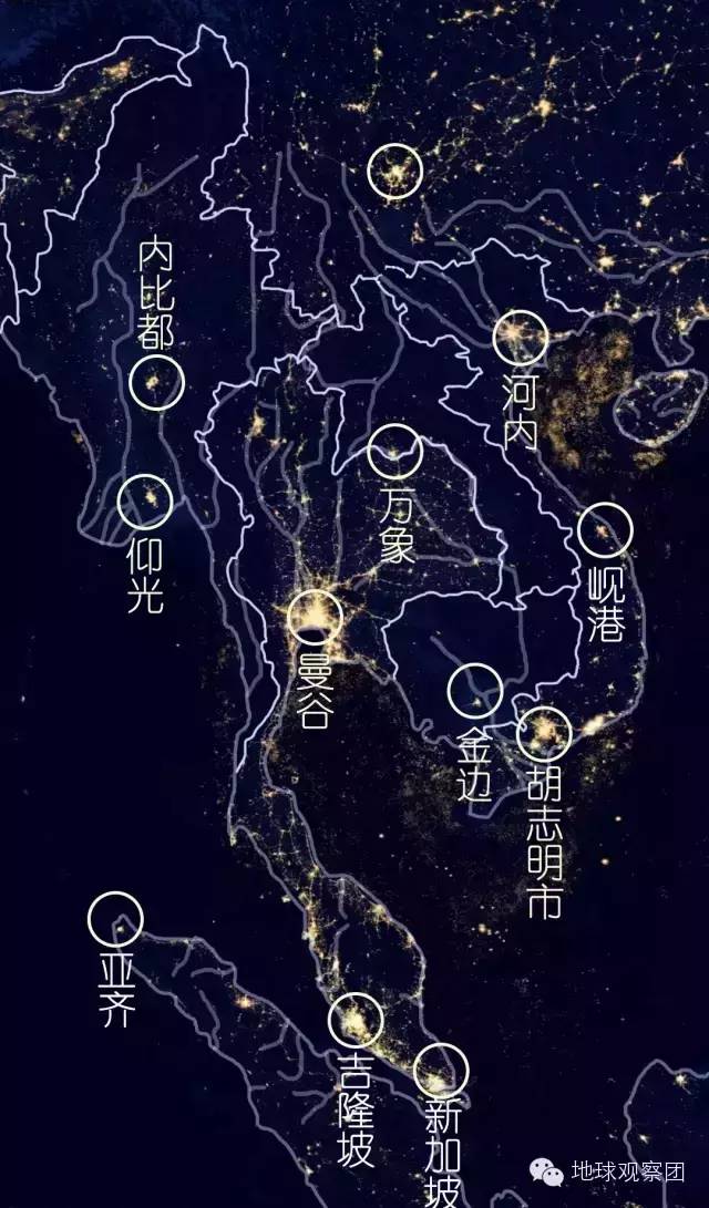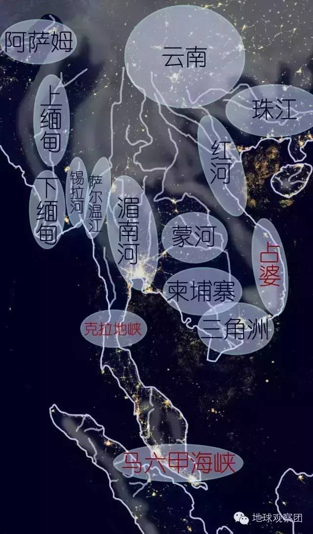 这众多或大或小的河流所冲击出的平原与河谷也成为中南半岛的几个稳定的农业区与人口聚集区(在古代自然是主要经济区),即使在现代也依然如此,如灯光图中,中南半岛主要城市与人口基本仍在传统的农业区。