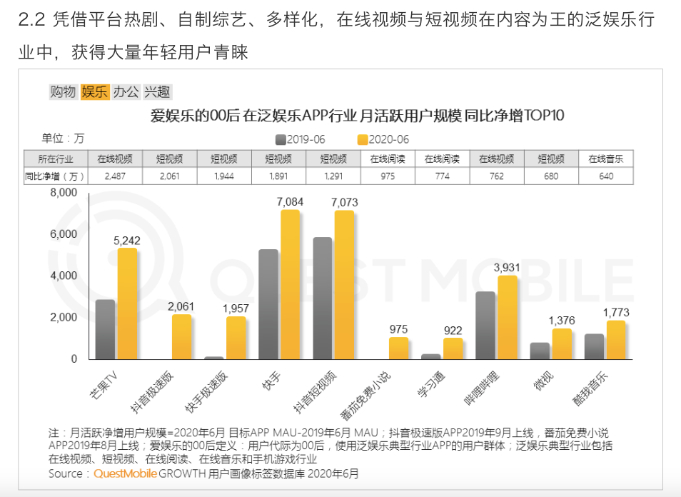 在8月初,第三方机构QuestMobile发布的《2020圈层经济洞察报告》中就提到,凭借热剧、自制综艺,在线视频和短视频在泛娱乐行业获得大量年轻用户的青睐。其中,芒果TV和B站西瓜的成长性不容忽视。