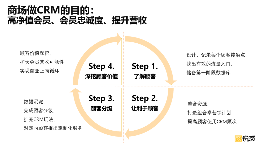 从上图来看,商场做 CRM 的目的有三点:挖掘高净值会员、提高顾客忠诚度、获取更大营收。
