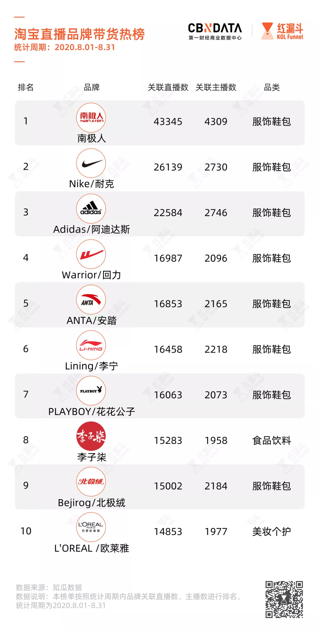 根据知瓜数据对淘宝直播品牌的监测,8月关联直播数TOP 10品牌与7月的品牌基本保持一致,南极人、耐克、阿迪达斯分别保住了自己前三的位置。其中,李子柒关联直播场次对比上个月减少了2496场,名次下降两位。