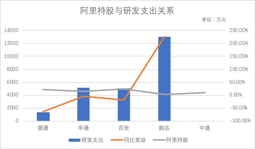我们将阿里对代表企业的持股比例纳入分析,由于阿里并未参股顺丰,故下图不包含顺丰,也由于中通财报未单独披露研发情况,研发支出部分也并未包含中通。