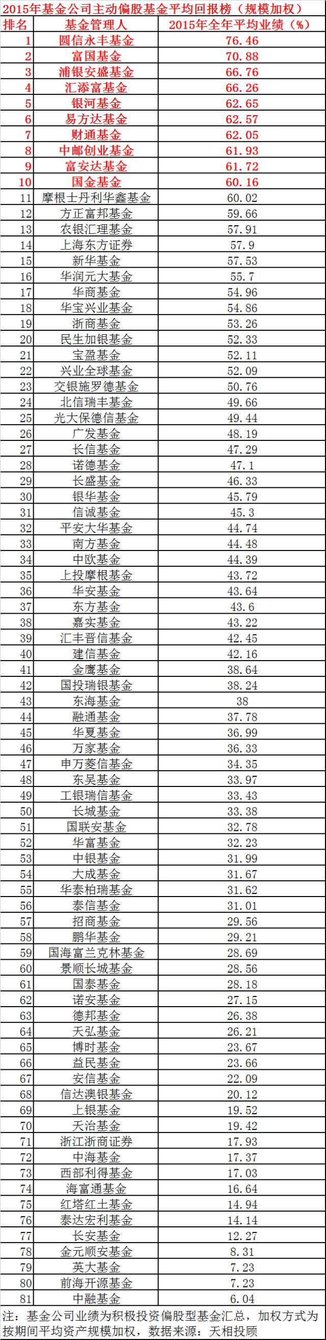 在各只基金2015年业绩出炉之后,天相投顾对各基金管理人旗下成立满一年的主动偏股基金投资业绩进行汇总平均,计算出基金公司旗下偏股基金平均回报率,而且以过去一年基金平均规模为权重进行加权计算,避免了小基金冲业绩、大基金业绩差的不公平情形。特别注意的是,该榜单没有考虑基金风格的差异,仅仅是收益率的平均,不构成投资建议,仅供参考。