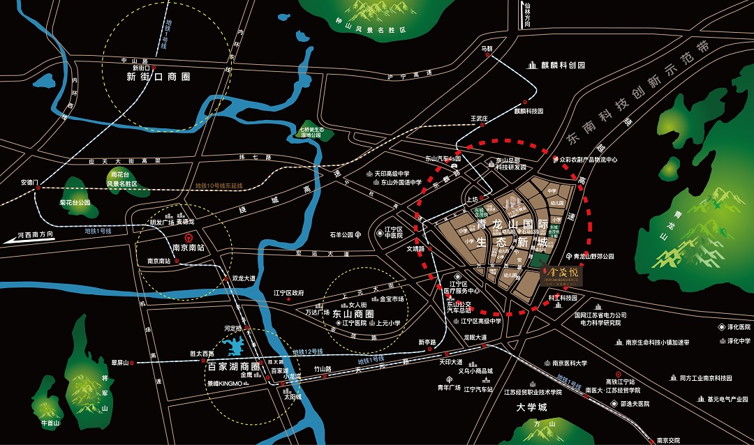 青龙山国际生态新城位于南京主城东南侧,北连麒麟、西接主城,为南京城市重点发展区域;是继江心洲之后的又一个一、二级联动新城开发项目,也是继南京江北核心区、鼓楼滨江、河西、南部新城之后,距离主城新街口半径12.5km圈内最后的热土。