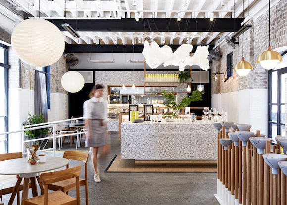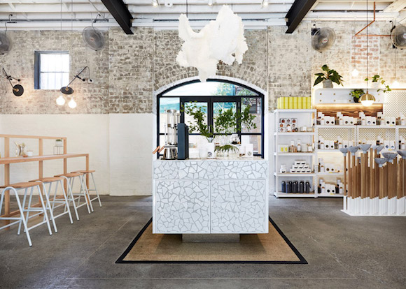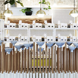 悉尼的这间茶馆原来是个工厂,在设计师 Matt Woods 一番改造后变成了一个温馨的小餐厅。为了凸显茶馆的定位,Woods用茶包纸做成了吊灯,又在空间的正中央放置了一个由不同高低木棍和茶碗做成的装饰装置——店里到底卖什么,一下子就一目了然了。