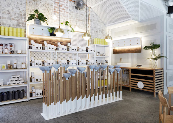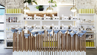当现在的店铺普遍被设计得越来越美,消费者进店能被“一次击中”,从而流连忘返的概率就变得愈来愈低。有时候,过于精美的店铺设计还会抢了在售商品的风头。这时候,有设计师就顺势想到了要把商品用作最重要的内饰设计元素,来让整个店铺变得与众不同。