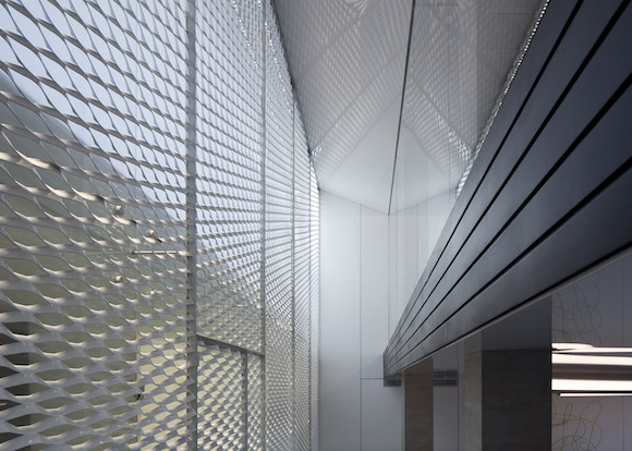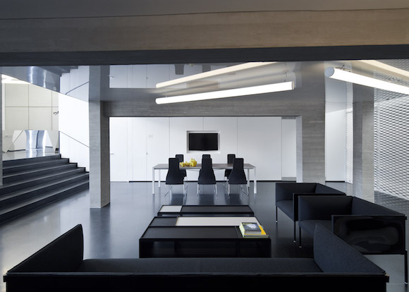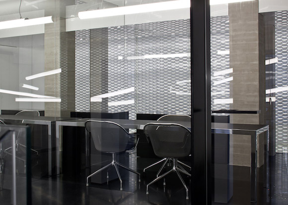 以色列本土设计师 Pitsou Kedem 负责楼盘的整体内饰设计,而这个售楼处的设计也出自他之手。他将样板间中用到的灯管、金属网、水泥砖、镜面等设计元素全部打散,围绕办公室、会客室、会议室这些固定空间,重新做了设计,商务氛围更浓,却仍然可以看到“家”的影子。